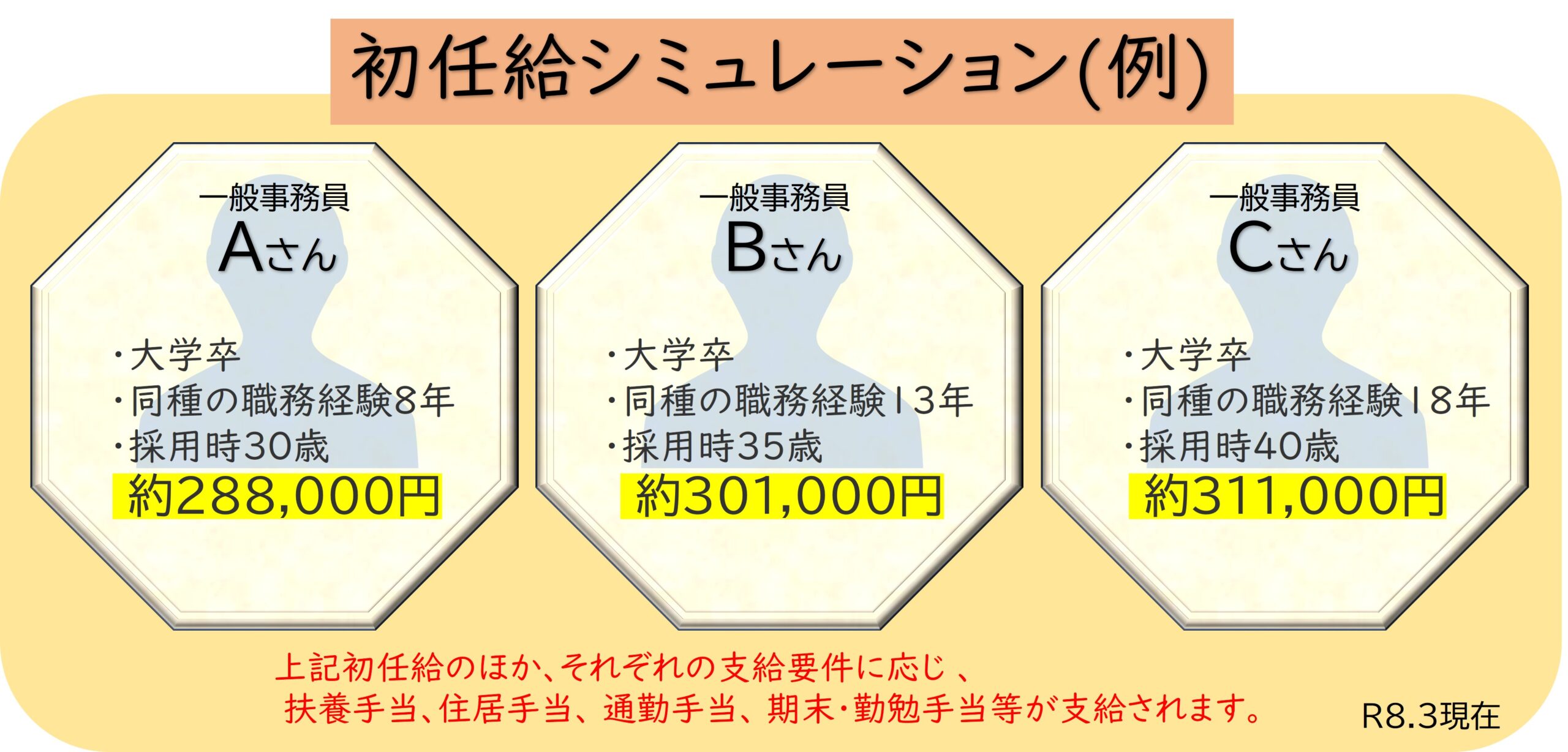 初任給は、職種(試験区分)によって異なり、また、各人の学歴や職歴等に応じて一定の基準により加算等される場合があります。